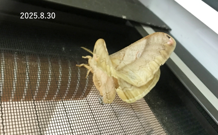 今年も大発生したクスサン、我が家の栗の木でもそだっていたのかも。とまっていたのに気づかずロール網戸を巻いてしまった。翅がカールしてる。